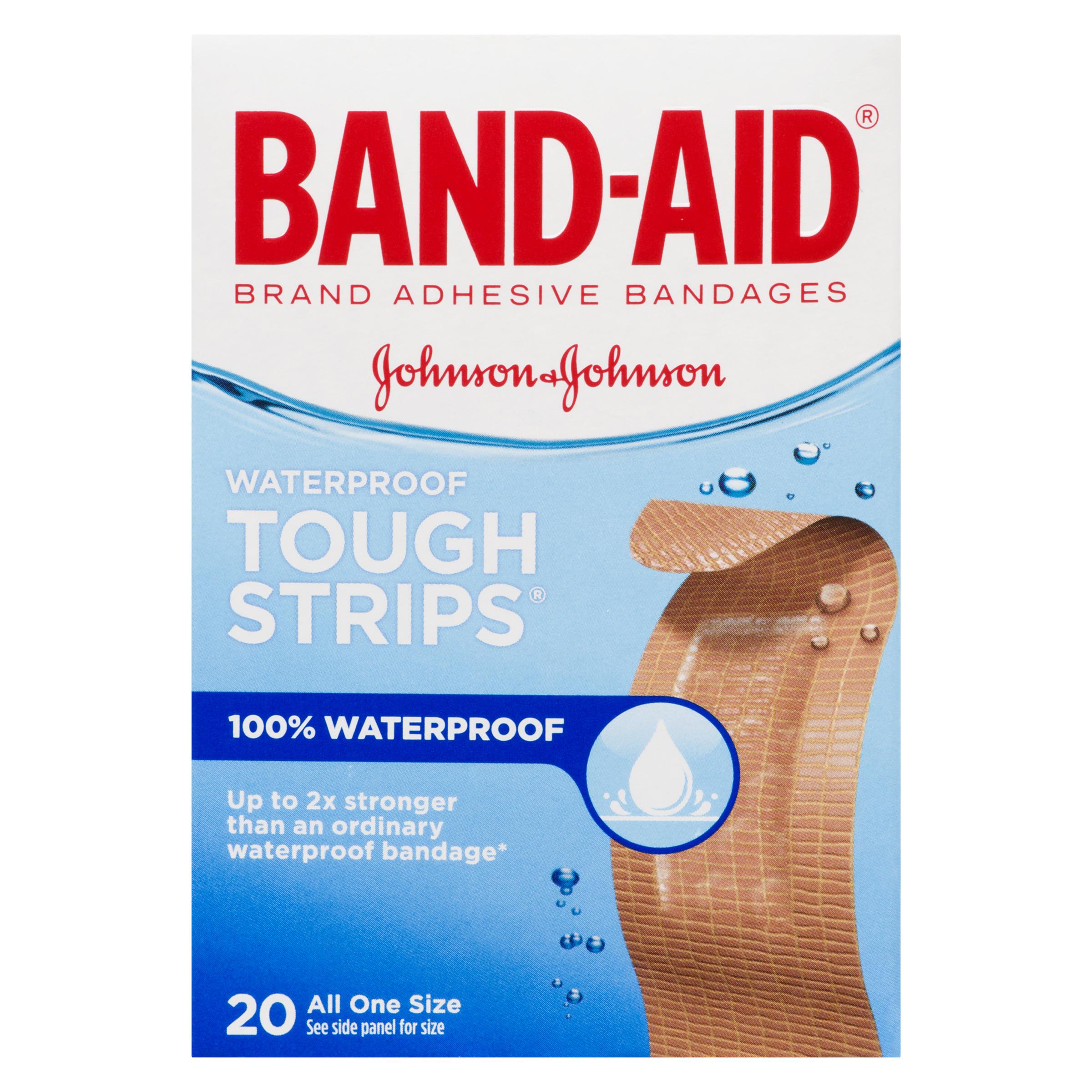 BAND-AID® Brand WATER BLOCK® TOUGH-STRIPS® Bandages keep out water, dirt, and germs even when wet. These bandages feature strong adhesive to keep them in place and a four-sided seal that keeps pad dry while blocking out water, dirt and germs. Please note that BAND-AID® Brand TOUGH-STRIPS® Adhesive Bandages are not intended for use on sensitive or delicate skin. This package contains 20 sterile bandages.