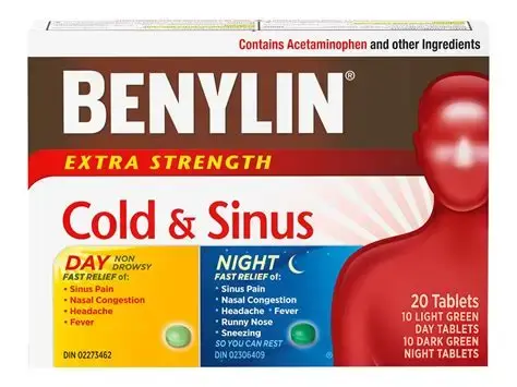 •Benylin Extra Strength Cold and Sinus Day/Night Tablets, 20 Count, are a portable and convenient solution to relief your cold and sinus symptoms during the day and night •Get fast, effective relief of sinus pain, nasal congestion, headache and fever •Each package contains 20 tablets with 10 Day tablets and 10 Night tablets •Both Day and Night tablets contain 5 mg of decongestant Phenylephrine Hydrochloride to relieve nasal congestion and 500 mg of analgesic Acetaminophen to relieve sinus pain, headache and fever •Night tablets also contain 2 mg of antihistamine Chlorpheniramine Maleate to relieve runny nose and sneezing
