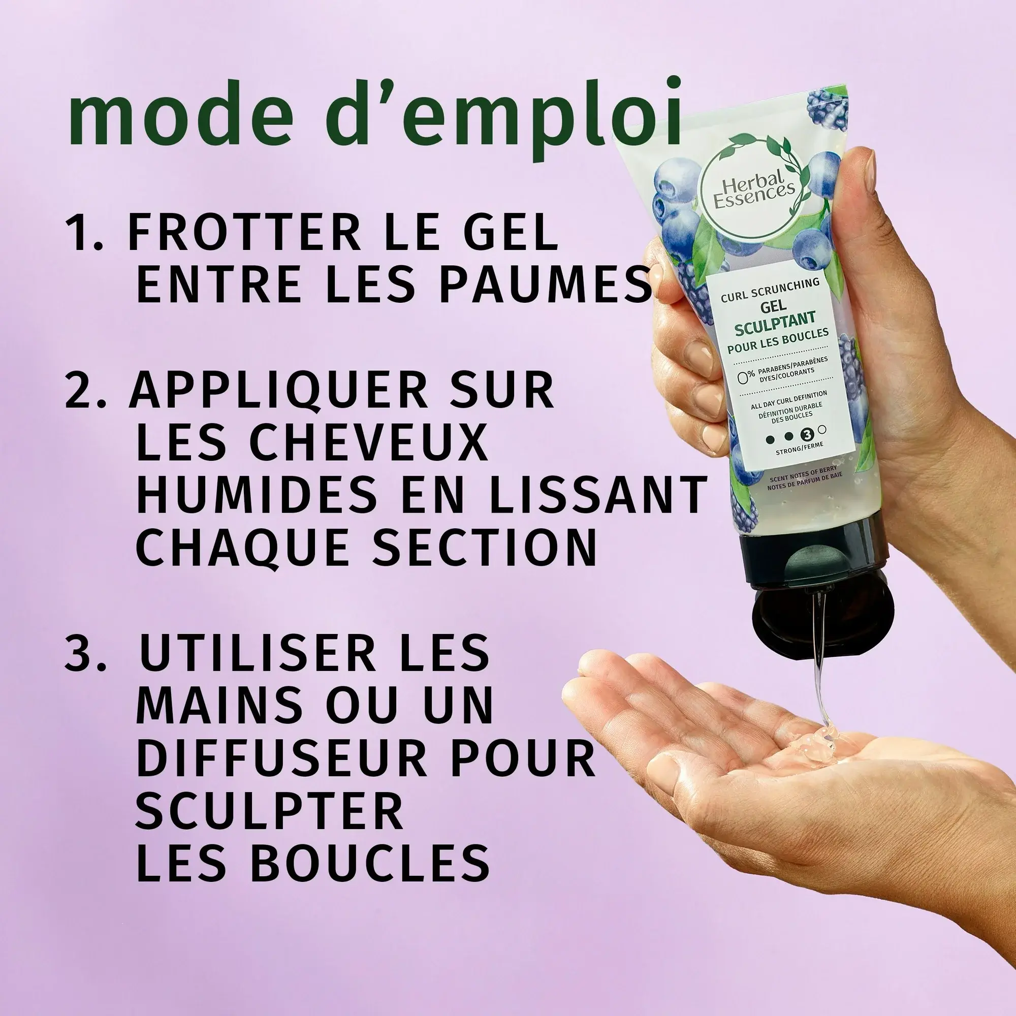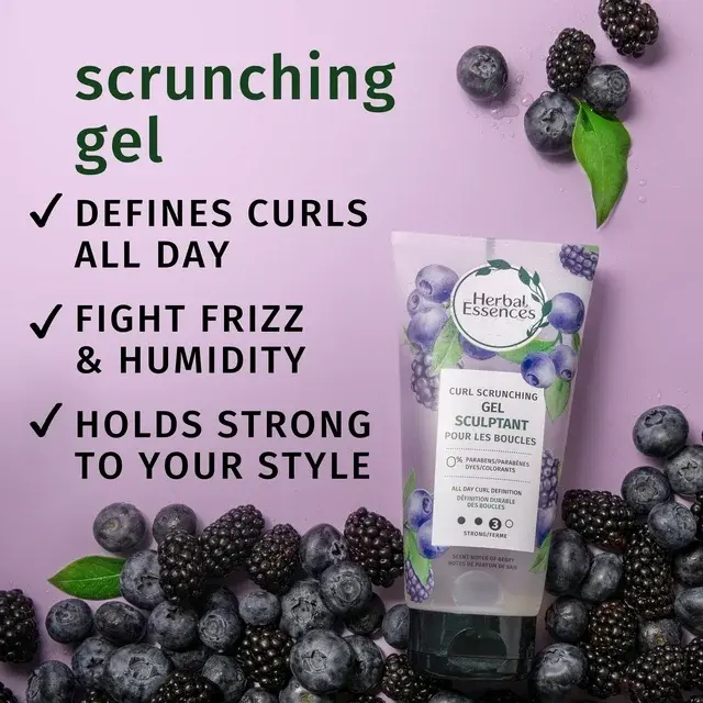 Fight the frizz and the humidity with Herbal Essences Curl Scrunching Gel. This curly hair gel gives your curls an all-day-strong hold. Even better, its humidity-protection and frizz control last for 24 hours. Enjoy a full day of perfectly defined curls—no matter what Mother Nature decides to throw at you. You’ll love the fresh berry scent, too. Go ahead—discover how good it feels to use a hair gel that's certified PETA Cruelty-Free, paraben-free, mineral-oil free, color-safe, dye-free, and pH-balanced. Pair it up with the entire Herbal Essences Lavender Curls collection and experience the feeling of real results with infused ingredients inspired by nature.